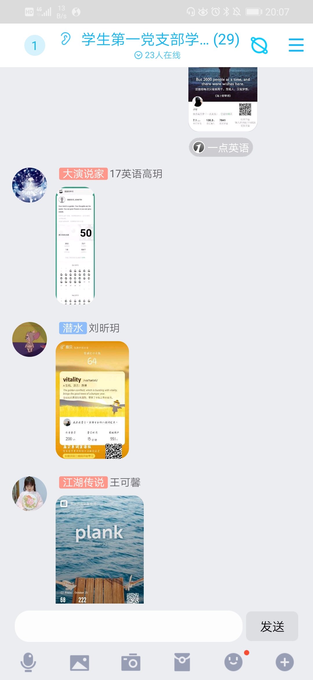 每周星期一到星期五,每天早上7:00至7:40,在學(xué)生一食堂選擇相對固定的位置,大家集中在一起,有的練習(xí)聽力、有的練習(xí)閱讀、有的練習(xí)口語,時(shí)不時(shí)相互交流,成了食堂里一道亮麗的風(fēng)景。除了堅(jiān)持每天晨讀,外國語學(xué)院學(xué)生第一黨支部還建了“學(xué)生第一黨支部學(xué)習(xí)打卡”QQ群,晚上同學(xué)們的單詞練習(xí)、課后復(fù)習(xí)等內(nèi)容,通過連接、拍照等形式在群里打卡,匯報(bào)自己的學(xué)習(xí)情況。一早一晚、一讀一練、線上線下,既養(yǎng)成了良好的學(xué)習(xí)習(xí)慣和生活習(xí)慣,也為專業(yè)知識的學(xué)習(xí)奠定了良好基礎(chǔ)。