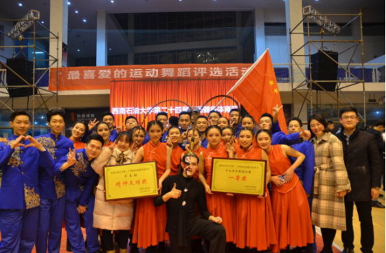 2018年11月29日晚,西南石油大學第二十四屆全民健身體育節學生體育舞蹈比賽暨閉幕式在校體育館隆重舉行。十四支來自不同院系的隊伍聚在一起,他們用不同風格的舞種揮灑激揚的魅力,綻放青春的風采。我院學生體育舞蹈隊憑借精彩絕倫的表演以9.63的最高分力壓群雄斬獲第一名,獲得學生體育舞蹈比賽一等獎及學生組精神文明獎。