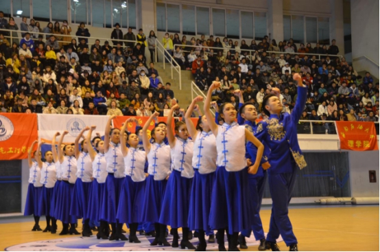 外國語學院學生體育舞蹈隊共有12對成員,為第五個出場的比賽單位。此次表演的舞蹈主題為《黃河頌》,表演融合了倫巴、恰恰、牛仔、華爾茲等多個舞種,伴隨著雄壯的音樂,他們用極具表演性、觀賞性、運動性的新穎舞蹈編排、豐富的隊形變化、別具一格的造型、以及令人驚喜的瞬間換裝征服了現場的評委和觀眾。舞者們用他們精湛的舞技展現了黃河的雄偉氣勢,充滿力量,一氣呵成,激情澎湃。大家發出陣陣驚呼的同時感受到了抗日救亡時期中華兒女的萬丈豪情和奮斗不屈的精神。表演結束后,觀眾“激情飛揚,外語最強”的口號聲響徹場館,掌聲雷動。