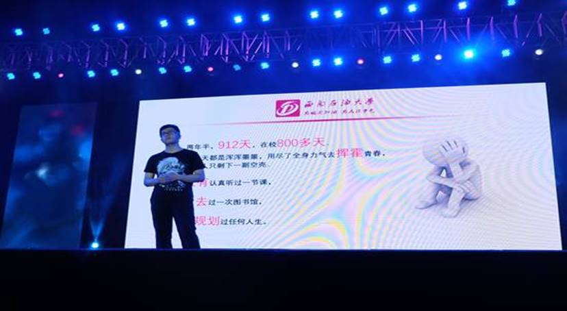 除此之外,今晚最令人感動的是來自一位讀了五年大學的學長——廖文豪的故事。他用他的親身實例,為我們講述了一個學霸的成就故事。“不畏懼失敗,把堅持養成一種習慣”,這是石大人廖文豪的經驗。在此過程中,廖爸廖媽的出現真情流露,為整個晚會帶來了意想不到的驚喜。