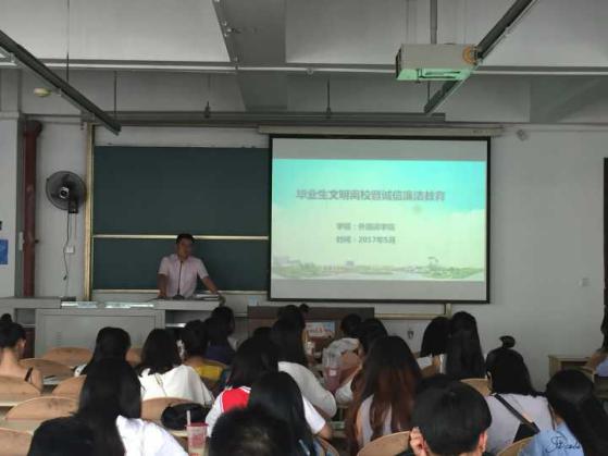 2017年5月31日下午15:00于思學樓召開了“畢業生文明離校暨誠信廉潔教育”2017屆外語院畢業生畢業季主題活動。我院孫德剛書記主持了本次畢業季主題活動,全體17屆畢業生們參與了本次活動。