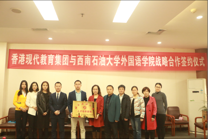 隨后香港現代教育集團人力資源總監楊春林與西南石油大學外國語學院院長孫陽代表校企雙方簽字,校企雙方正式形成戰略合作關系。隨后香港現代教育集團人力資源總監楊春林與外國語學院黨委書記方可代表了校企雙方完成了授牌儀式。
