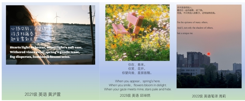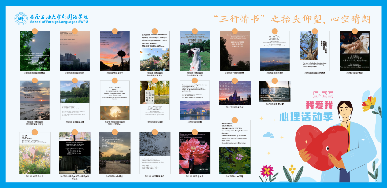 2024年5月由西南石油大學(xué)外國語學(xué)院心理健康協(xié)會舉辦的三行情書之“抬頭仰望,心空晴朗”心理健康教育精品活動順利開展并取得圓滿成功。此次活動于線上開展,面向全校學(xué)生,緊扣堅韌與自愛主題,要求同學(xué)們采用中外雙語的形式提交作品。