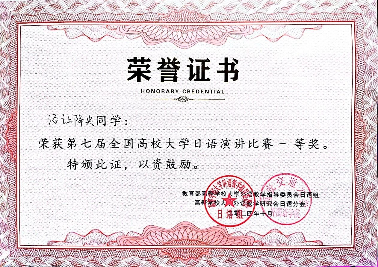 10月19日,第七屆全國高校大學日語演講比賽在重慶落下帷幕。外國語學院2022級俄語專業學生洛讓降央經過充分準備,在預賽、決賽中脫穎而出,斬獲全國總決賽一等獎,郝曉曦老師榮獲優秀指導教師稱號。