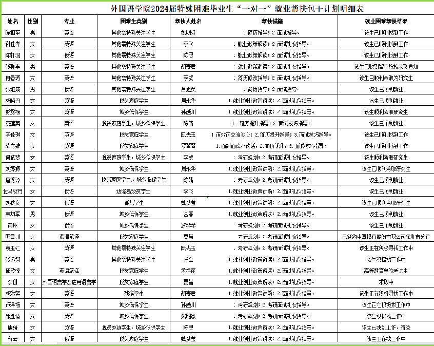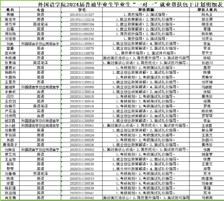 根據《四川省教育廳關于做好2024屆全省普通高校畢業生就業創業工作的通知》、《西南石油大學2024屆畢業生就業工作實施方案》和《外國語學院2024屆畢業生就業工作實施方案》等文件精神,結合學院實際,院黨政班子成員、專業教研室負責人、輔導員、班主任對特殊困難學生實行“包干制”,專業教師(畢業設計指導教師、研究生導師)對所指導的學生(特殊困難學生除外)實行“包干制”,開展結對幫扶,確保每一個困難學生得到有效幫助,對有就業意愿的就業困難畢業生群體做到“就業百分百”,切實落實畢業生就業幫扶與指導責任。現就就業幫扶包干計劃明細表公示如下: