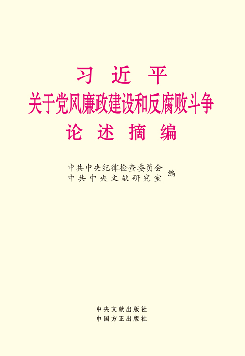 《習近平關于黨風廉政建設和反腐敗斗爭論述摘編》一書,2015年1月出版發行。《論述摘編》共分9個專題,收入216段論述,摘自習近平同志2012年11月15日至2014年10月23日期間的講話、文章、批示等40多篇重要文獻。其中許多論述是第一次公開發表。