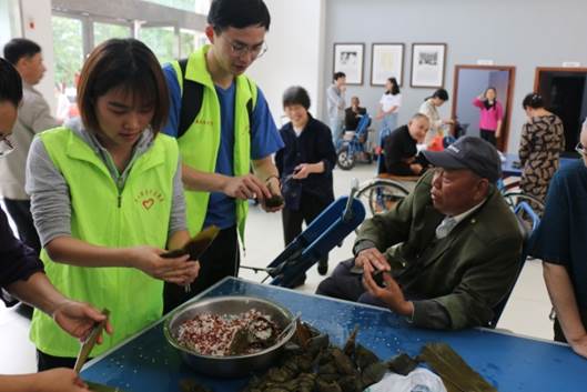 志愿者與傷殘軍人一起包粽子