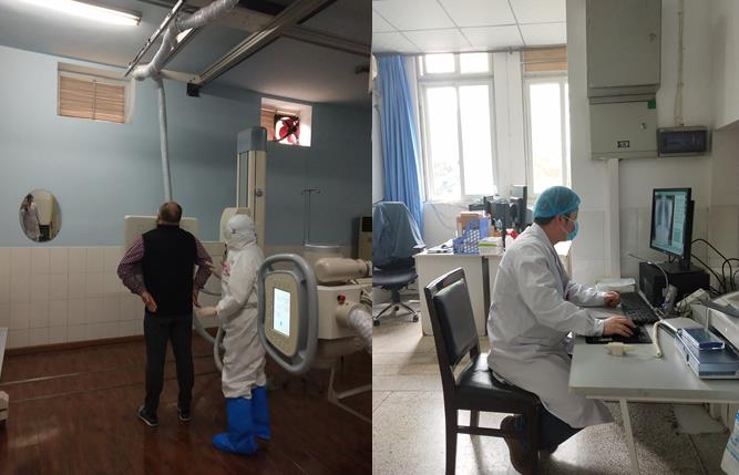 下午2:30,隨著演練總指揮張繼紅宣布演練開始,各部門行動起來。模擬場景是新型冠狀病毒肺炎疫情剛結(jié)束后,一例學(xué)生出現(xiàn)發(fā)熱、干咳、乏力等癥狀,到校醫(yī)院就診。預(yù)檢分診的醫(yī)生接診病人,檢測體溫、詢問病史,然后轉(zhuǎn)送至校醫(yī)院發(fā)熱門診篩查點,由發(fā)熱門診醫(yī)生進行進一步篩查、詢問,通知檢驗科床旁采血化驗,并專人護送患者到放射科進行胸片檢查,檢驗和胸片結(jié)果匯總到醫(yī)療組,進行會診,得出處理結(jié)果,最后由醫(yī)院的發(fā)熱病人轉(zhuǎn)運車將病人轉(zhuǎn)運到上級醫(yī)院進一步治療。