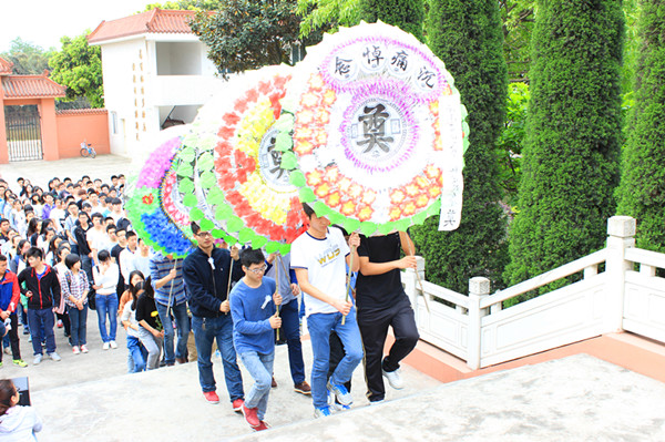 學生帶便獻花圈