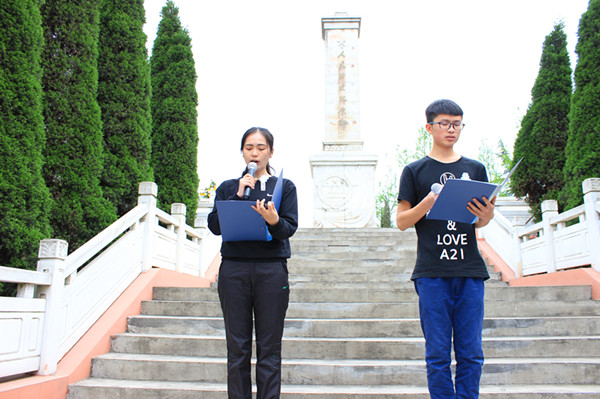 “高聳的紀念碑,訴不完我們無盡的敬意;蒼松和翠柏啊,道不盡我們深切的懷念。今天我們是桃李芬芳,明天是國家棟梁。今天我們團聚一堂,明天我們將掀起名族富強的巨浪!先烈們,我們為你們驕傲,你們將為我們自豪!以我熱血青春,創造祖國美好明天!”同學們莊嚴鄭重的宣誓,銘記先烈的英勇事跡,以青春熱血奮發圖強。