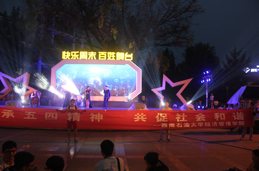 演出開始前,“桂湖講壇”邀請作家劉安祥先生就“勞動的人生是最美的”進行了精彩演講。我校大學生藝術團帶來了精彩的節目《月半小夜曲》,悅耳的聲音流進在場觀眾的心間。經管院學生代表用“傳承五四精神,共促社會和諧”的橫幅為活動加油,向社會群眾表達了當代大學生敢于承擔社會責任的決心與信念。