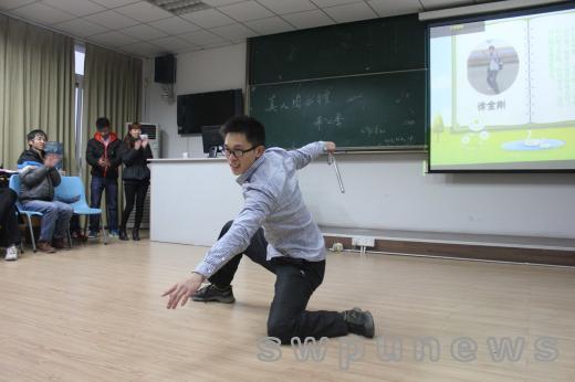 徐金剛就狀態、目標、學習、興趣,就業等方面向我們講述了他的大學生活經歷,為同學們提供經驗。他說:“每個人在大學都會有一段‘迷茫期’,但迷茫并不可怕,只要我們有目標,并努力堅持,就能走出迷茫,走向成功”。隨后,他向在場同學表演了自己最拿手的雙節棍,意氣風發,再次博得一片叫好聲。