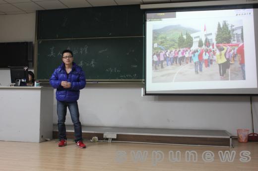 張濤給大家簡單的介紹了一下自己的支教過程,并分享了支教時的感人圖片。最后他特別提到一片名為“叔叔阿姨,你們不要再來支教了”的文章,他說:“今天的支教是為了明天不再支教”,支教時我們應該相互尊重,降低身份,注重與孩子們心與心的交流。