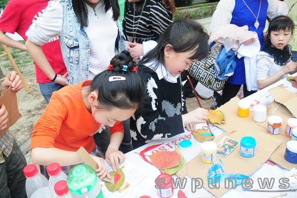綠舟協會植物組同學帶領小學生及其父母和老師游覽校園,并做簡單的植物認知活動,在認知過程中讓大家撿一些自己喜歡的漂亮的落葉,把水彩顏料涂在葉子上,然后用葉子把顏料印在白色的T恤上。