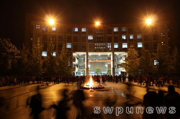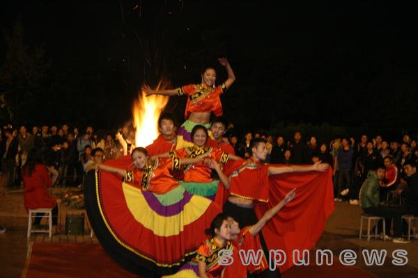 隨之而來的篝火點燃儀式上,身著各式藏袍的藏族同學揮動著潔白的哈達,跳起了歡快的“鍋莊舞”。幾百名同學圍著熊熊的篝火齊跳鍋莊,歡騰的歌聲、激越的鼓點,片片歡聲笑語回蕩在廣場的上空。