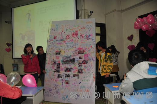 最后,成果展進(jìn)入到愛(ài)心互動(dòng)環(huán)節(jié),在座的每位同學(xué)用一張紙現(xiàn)場(chǎng)寫(xiě)下祝福語(yǔ),貼到展板上,匯聚成一個(gè)巨大的“愛(ài)心形狀”。
