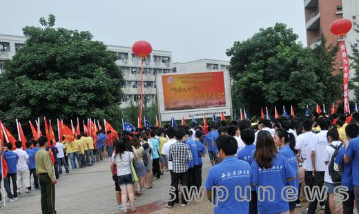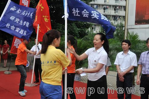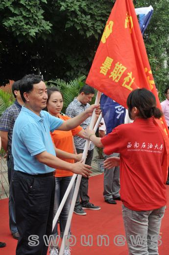 共青團成都市委學校部部長寧可、校黨委副書記孫一平、黨辦校辦、組織部、宣傳部、學工部、教務處、招生就業處、政治學院負責人、指導教師代表、學生代表參加了儀式。寧可、孫一平為即將出征的實踐隊授了旗。儀式由校團委書記李忠偉主持。