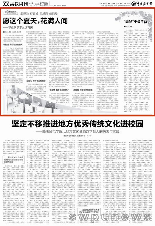 6月11日,中國教育報第八版頭條,并以半版的篇幅,以《愿這個夏天,花滿人間》為題,報道我校以及其他高校在畢業生離校方面好的做法。