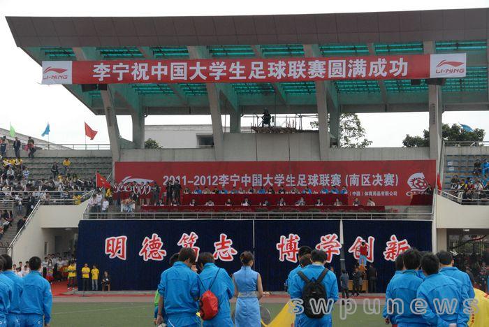 4月17日,2011—2012李寧中國大學生足球聯賽南區決賽在我校開幕,來自全國14個省市區的16支大學足球勁旅齊聚蓉城,共同掀起一場“智取不凡,足載未來”的綠茵風暴。各路人馬都將使出渾身解數,在比賽中一決高下,爭奪南區第一這一寶座。