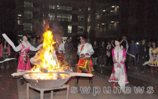 7點左右,民族文化協會會長盧義成點燃晚會火把。身著各色各式藏族服裝的藏族同學跳起了歡快的“鍋莊舞”,揮動潔白的哈達,慶祝屬于所有藏族同胞的節日。熱烈的氣氛也感染了周圍的老師和同學,他們也紛紛加入狂歡的隊伍。晚會持續到11點結束。
