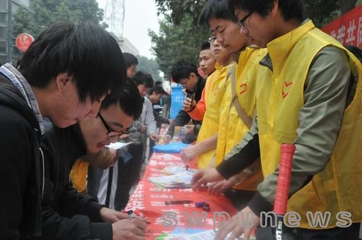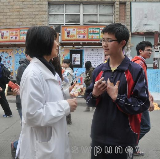 每年的3月24日是“世界防治結(jié)核病日”。為向廣大同學(xué)宣傳結(jié)核病預(yù)防知識(shí),提高預(yù)防保健意識(shí),3月20日中午,新都區(qū)衛(wèi)生局、新都區(qū)疾病預(yù)防控制中心、我校大學(xué)生安全與健康協(xié)會(huì)、校醫(yī)院聯(lián)合開展了“你我共同參與,消除結(jié)核危害”的專題宣傳。