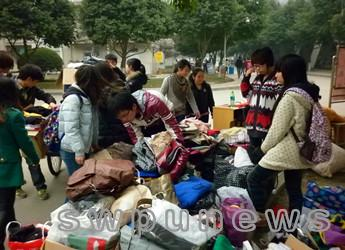 活動現場,經管院青志協的活動場地上堆滿了來自各年級專業同學捐贈的衣物和書籍。牛仔褲、運動鞋、裙子、襯衣以及同學們閑置的書籍等應有盡有,不少同學帶著自己準備捐獻的東西趕到現場。