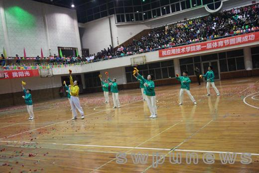 開幕儀式后進行了文體表演,離退休老年文體協(xié)會的老師的健身球操、學生的軍體拳、應(yīng)用技術(shù)學院領(lǐng)導代表隊和后勤代表隊的教工拔河比賽展現(xiàn)了南充校區(qū)良好的體育文化氛圍。
