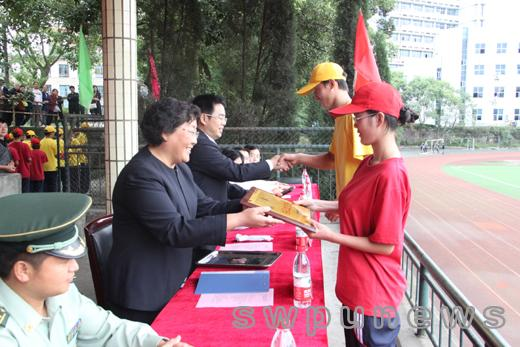 9月29日下午,應用技術學院2011級新生軍訓匯報表演暨總結表彰大會在南充校區田徑運動場舉行。校長杜志敏,副校長、南充校區管委會主任趙正文出席了大會。會議由應用技術學院黨委副書記、軍訓團政委鄧洪波主持。