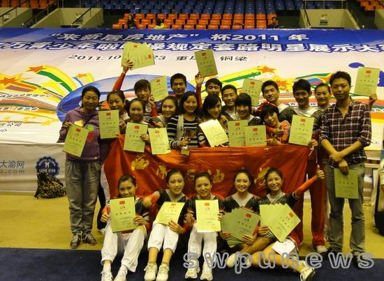 10月20-23日,由國家體育總局體操運動管理中心主辦的“2011年全國億萬青少年啦啦操規定套路明星展示大賽”在重慶銅梁金龍體育館舉行,來自全國大中小學和體育俱樂部的71支參賽隊伍和數千名運動員參加比賽。由夏小平為領隊,孫玲玲、彭亮為教練的西南石油大學參賽隊榮獲大學組啦啦操規定套路一級技巧第一名。