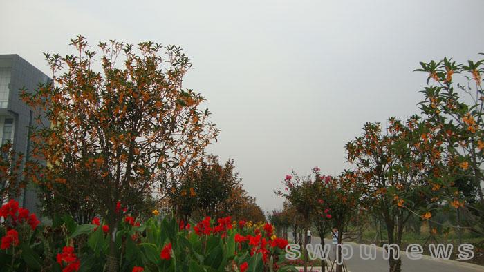 由后勤施工建成于5月的二期校園景觀大道綠化,起于游泳池北端,終于鴻運大道南面的北校門,總長度近700米,總面積約2500平方米,由多個長方形、正方形花池和休閑坐椅組成,是學校最重要的景觀節(jié)點,具有游憩觀賞、聚會交流、靜讀學習等動靜結合的多項景觀功能。植物配植上除高大挺拔的銀杏、華蓋濃蔭的黃葛樹外,主要景觀樹即是縱貫南北列植的近300株樹型優(yōu)美的丹桂,是賞桂的絕佳去處,現(xiàn)正花香襲人。三五好友,圍坐其間,品茗聞香,吟詩賞桂,真正領略“ 桂子月中落,天香云外飄”的樂趣。盛花期時,微風吹來,還能享受到紛紛揚揚飄落的“桂花雨”。