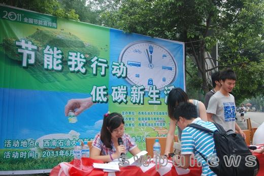 “廢棄舊品要巧用,杜絕筷子一次性,循環水源多次用,低碳環保我做起。”2010級油儲專業的王殷唱著順口溜與社團聯、綠舟協會的同學一同向過往的學生宣講節能低碳。