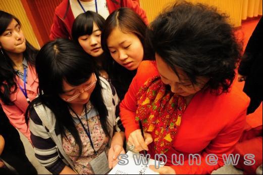 在講座中,葉鶯強調了學會溝通與包容的重要性。“在這個世界上有許多誤會來自溝通失敗,被舌頭絆倒的人比被困難絆倒的人還要多?!比~鶯分析,“人在社會就應該學會溝通,學會包容。我的座右銘就是海納百川,有容乃大。高飛離不開群雁,同學們一定要記住包容的重要性。