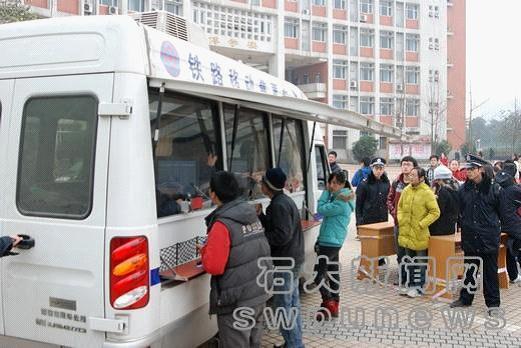 為解決學生購票難問題,同時讓學生集中精力搞好期末復習,經學校聯系,成都火車站移動售票專車今天上午開進學校,專門向我校學生出售火車票。據了解,硬臥學生票的預售期為10天,硬座學生票為15天。