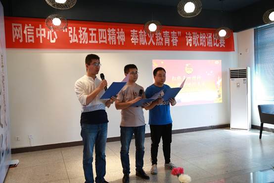 在比賽中,中心各科室選手緊扣活動主題、動情朗誦。本次比賽的參賽題目分別為:網絡安全與運行部的《五四的火焰》、信息化開發與推進部的《青春》、數據與系統運維部的《唱響五四之歌》、教學運行保障部的《青春中國》、教學信息化與數字媒體制作部的《中華頌》、校園卡管理與綜合事務部的《五四之火永不停熄》等,共6組。參賽選手們圍繞頌揚五四精神為主題,時而緬懷革命先烈、時而謳歌火熱青春、時而贊美祖國強盛、時而描繪遠大理想,大家情緒飽滿、鏗鏘朗誦,盡情抒發青年的愛國主義情懷。由于比賽前的精心準備,不少參賽選手在著裝、背景音樂、舞美PPT制作等方面均呈現出了較好的狀態,在朗誦時的發音咬字和語速、肢體語言等方面也體現出了較高水準。經過精彩的角逐,本屆大賽的一等獎由數據與系統運維部摘得,教學運行保障部榮獲二等獎,校園卡管理與綜合事務部榮獲三等獎。姬靜,肖曉華分別為一、二、三等獎選手頒發獎品。