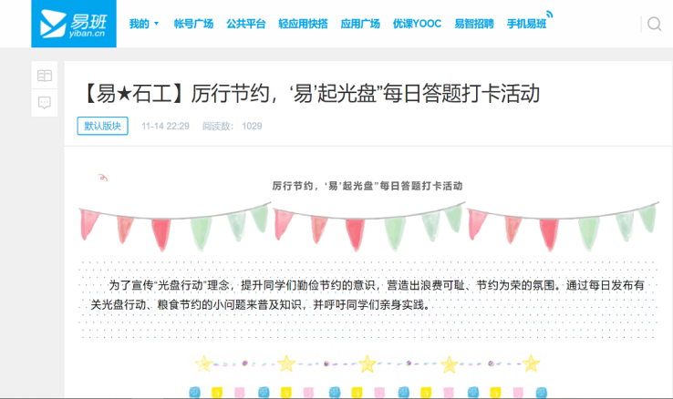 11月初開展“易”同打卡,節(jié)儉宣傳“易”線牽,通過(guò)易班向全院發(fā)出活動(dòng)通知,以易班app為載體,倡導(dǎo)每位同學(xué)每天晚上要簽到打卡,簽到打卡上傳今日一日三餐的“光盤”圖片,從每“易”餐開始,實(shí)施光盤行動(dòng),養(yǎng)成勤儉節(jié)約的好習(xí)慣并設(shè)置小禮品以資鼓勵(lì)。打卡輕應(yīng)用頁(yè)面瀏覽量達(dá)2138次,獨(dú)立訪客人數(shù)達(dá)1110,共計(jì)打卡516人次,新聞報(bào)道瀏覽量達(dá)1029次。