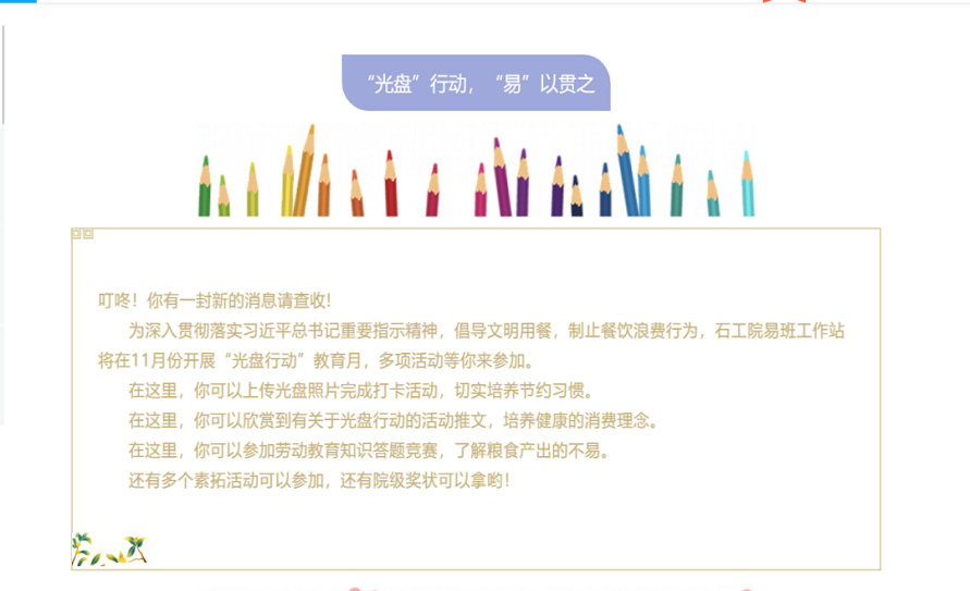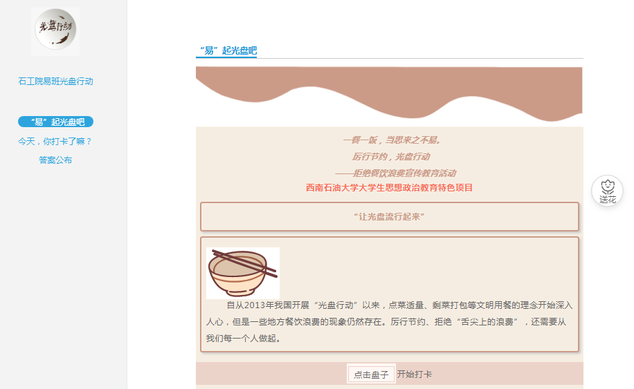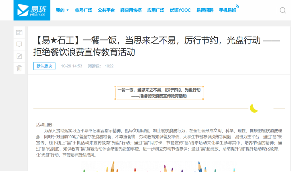 活動(dòng)利用今年國(guó)慶的時(shí)間節(jié)點(diǎn),依托學(xué)院易班工作站、大學(xué)生全媒體中心和各年級(jí)輔導(dǎo)員,利用易班的動(dòng)態(tài)、輕博客、輕問(wèn)卷等功能,廣泛宣傳勤儉節(jié)約的價(jià)值和意義,在全院學(xué)生中發(fā)起 “一餐一飯,當(dāng)思來(lái)之不易。厲行節(jié)約,光盤行動(dòng)”的倡議,發(fā)布本次活動(dòng)的內(nèi)容和計(jì)劃等,引起師生的關(guān)注和興趣。同時(shí),通過(guò)易班APP的打卡簽到等活動(dòng),來(lái)展開線上的餐前餐后對(duì)比活動(dòng),并利用易班輕應(yīng)用這一功能,開發(fā)“光盤行動(dòng)”系列輕應(yīng)用,吸引學(xué)生參與后續(xù)活動(dòng)。