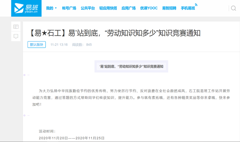 11月中旬開展“易”站到底,“勞動(dòng)知識(shí)知多少”知識(shí)競(jìng)賽,利用易班的優(yōu)課舉行線上知識(shí)競(jìng)賽“勞動(dòng)知識(shí)知多少”。以選擇題,判斷題、問(wèn)答題的方式,開展勞動(dòng)知識(shí)競(jìng)賽,并設(shè)置獎(jiǎng)項(xiàng),倡導(dǎo)廣大學(xué)生參加,勤儉節(jié)約,既收獲了知識(shí),也提升了能力。