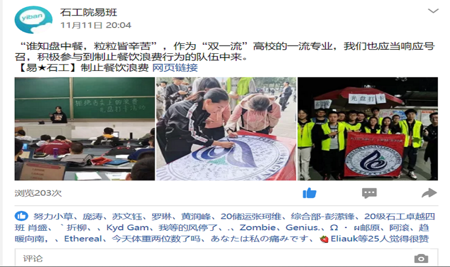 為深入貫徹落實(shí)習(xí)近平總書記關(guān)于制止餐飲浪費(fèi)行為重要指示精神,堅(jiān)決制止浪費(fèi)糧食行為,切實(shí)培養(yǎng)節(jié)約習(xí)慣,在校園內(nèi)營(yíng)造浪費(fèi)可恥、節(jié)約為榮的濃厚氛圍,形成文明、科學(xué)、理性、健康的餐飲消費(fèi)理念,西南石油大學(xué)第七批大學(xué)生思想政治教育特色項(xiàng)目《一餐一飯 當(dāng)思來(lái)之不易 厲行節(jié)約 光盤行動(dòng)—拒絕餐飲浪費(fèi)宣傳教育活動(dòng)》于10-11月在全校順利開展。