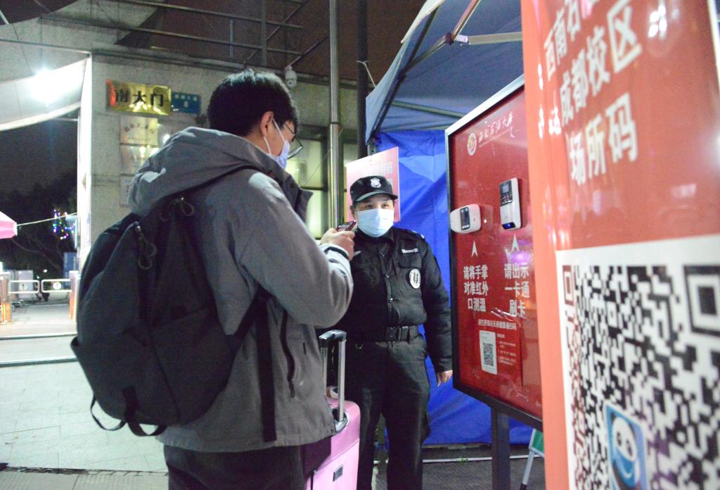 夜已經很深了,路途較遠的同學結束了旅途的奔波,返回校園,不耽誤第一天上課。圖為一名返校同學正在南大門辦理入校手續。
