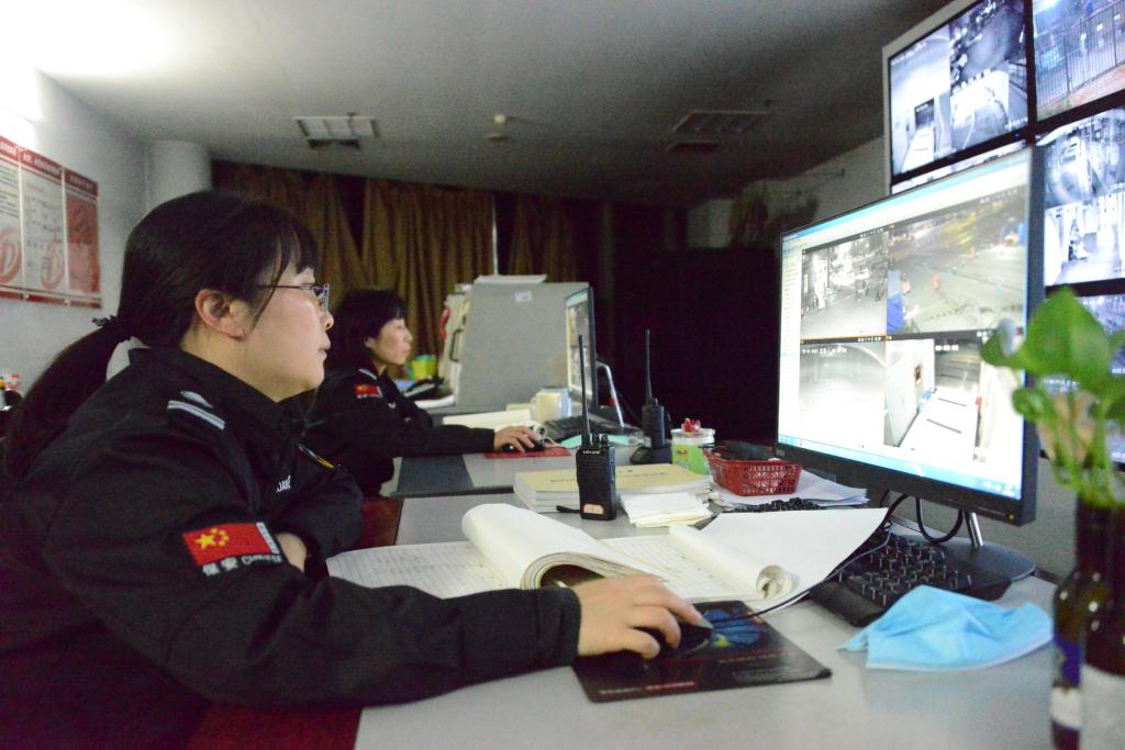 室外巡邏,室內監控。在監控室,值班人員正緊盯監控器,室內與室外聯動工作,確保校園安全。圖為工作人員在認真值班。