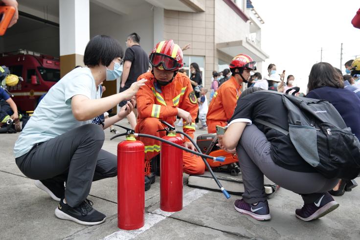 本次活動在新都工業區政府專職消防隊進行。消防隊負責人首先帶領全體老師參觀了消防車,熟悉了消防車輛的運作方式、了解消防訓練場地。專業的操作過程和高端的消防設備,展現了他們專業的營救技能。