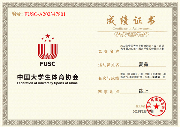 中國(guó)大學(xué)生健康活力“云”系列大賽由教育部中國(guó)大學(xué)生體育協(xié)會(huì)主辦,因疫情原因,大賽采用“云”比賽的形式進(jìn)行,來自北京、上海、深圳、廣東、山東、四川、新疆、安徽、陜西、河北、湖北、湖南等省市區(qū)的319所高校共計(jì)5496名運(yùn)動(dòng)員參賽。大賽分健美操、啦啦操、街舞等8個(gè)大項(xiàng)。啦啦操大項(xiàng)、街舞大項(xiàng)又分甲組(普通院校組)、乙組(高職高專組)和丙組(高水平組)。南充校區(qū)運(yùn)動(dòng)舞蹈隊(duì)分在甲組,與浙江大學(xué)、北京師范大學(xué)、中華女子學(xué)院、南京醫(yī)科大學(xué)等高校的71支隊(duì)伍同為一組參加啦啦操比賽,與浙江大學(xué)、華北電力大學(xué)、河南理工大學(xué)、安徽師范大學(xué)等高校的45支隊(duì)伍同為一組參加街舞比賽,競(jìng)爭(zhēng)異常激烈。最終,南充校區(qū)運(yùn)動(dòng)舞蹈隊(duì)榮獲啦啦操比賽自選動(dòng)作(舞蹈啦啦操集體街舞)全國(guó)第一名、街舞比賽規(guī)定動(dòng)作全國(guó)第六名的好成績(jī)。