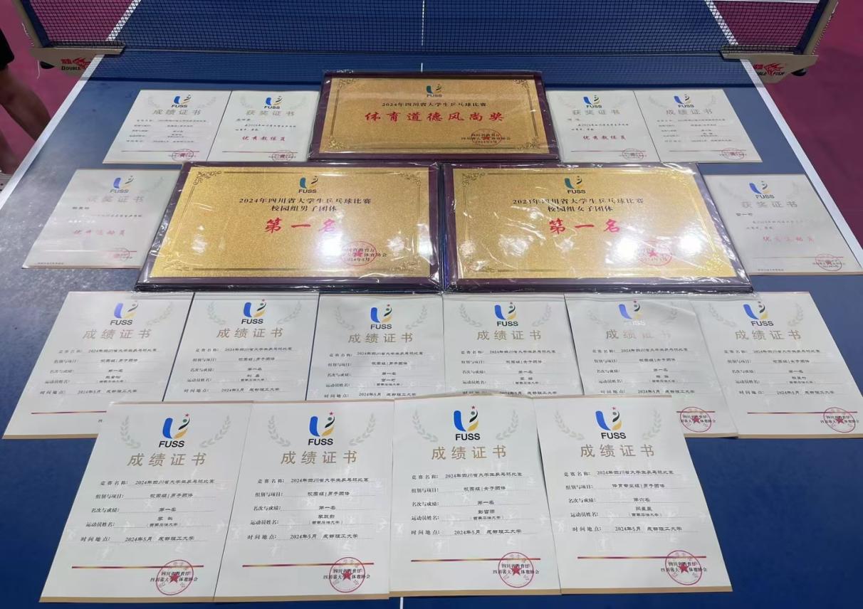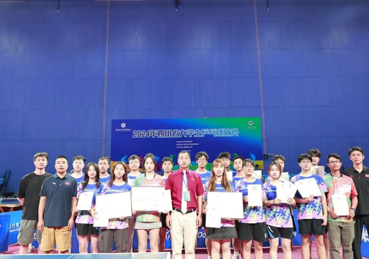 5月24日-26日,2024年四川省大學生乒乓球錦標賽在成都城東體育公園舉行。經過三天的激烈角逐,我校代表隊獲得男女團體、男女單打四枚金牌,并獲一項團體第六名和一項單打第七名。兩名教練和兩名學生分獲“優秀教練員”和“優秀運動員”稱號,我校獲得體育道德風尚獎。