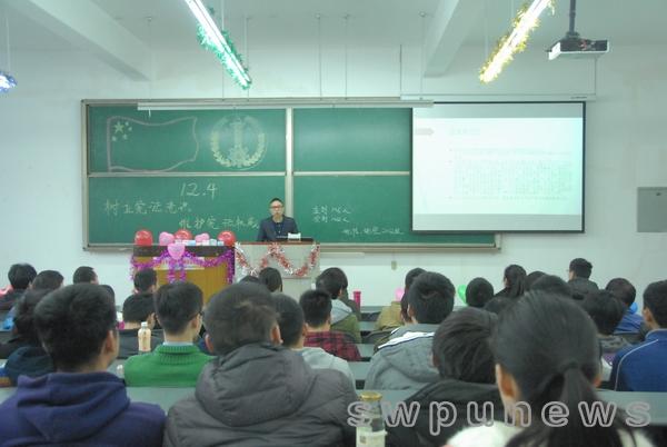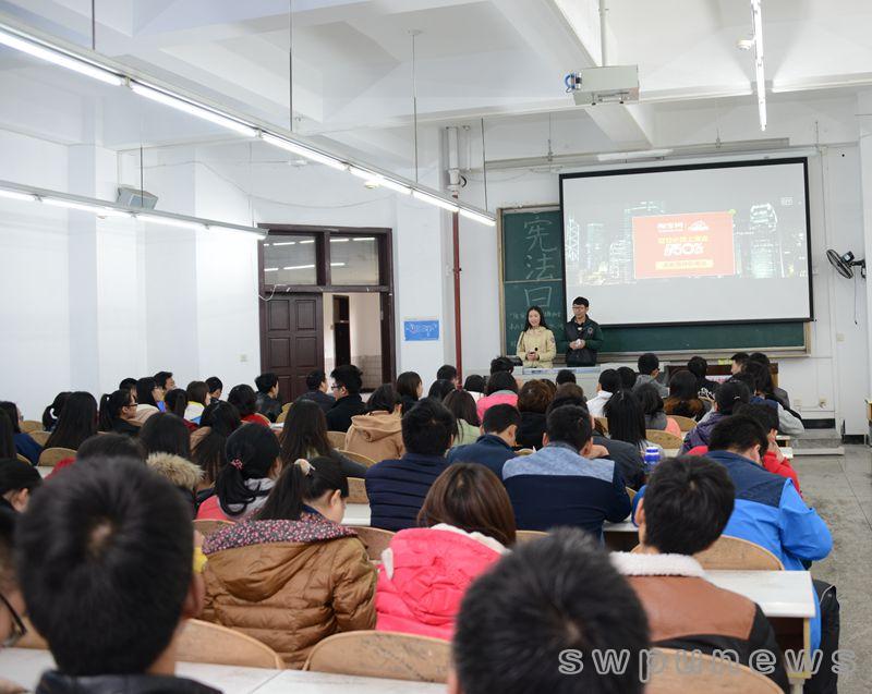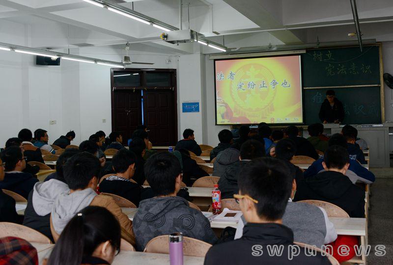 石油工程2014級7班、8班合辦的主題班會,進行了法理學和憲法基本知識講解。石油工程2014級8班同學還創作并朗誦了《法律之歌》,歌曰“有法可依,百業興旺。依法治國,定國安邦。保民護民,和諧起航。法律臂膀,圓夢中國。”