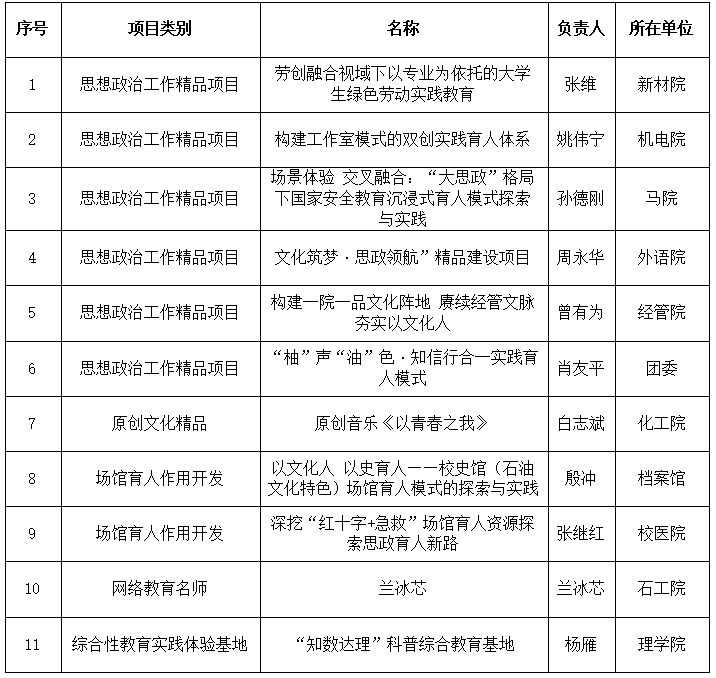 思政項目建設是扎實實施新時代立德樹人工程的重要舉措。為一步提升學校思想政治教育質量,學校批準設立校級思想政治工作質量提升綜合改革與精品建設項目。根據專家匿名評審結果,經立項公示、領導小組審定,擬準予立項5個類別11項校級項目,現將立項名單發布如下(排名不分先后)。