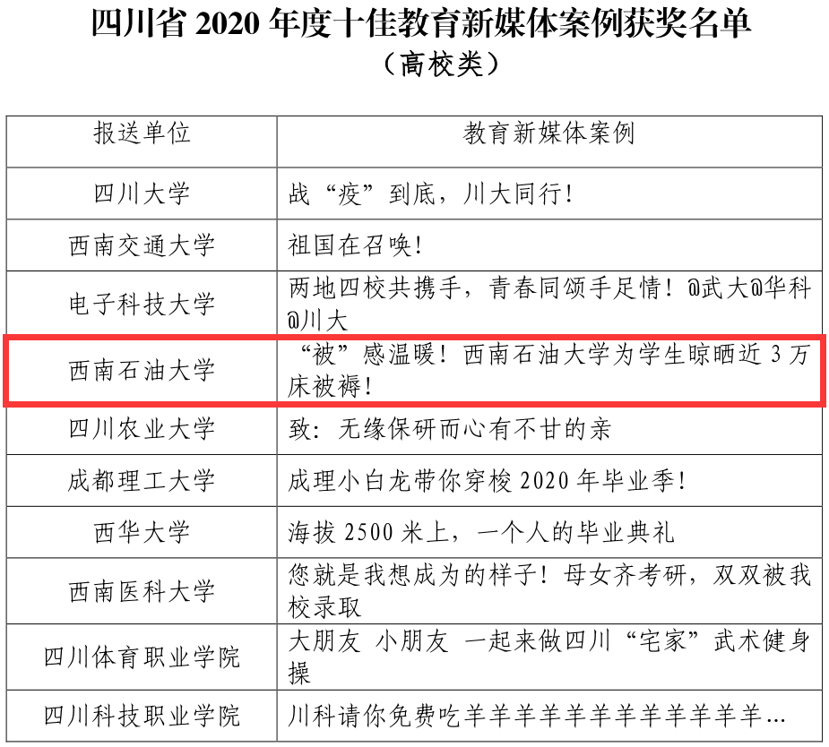 近日,四川省教育廳公布了2020年度十佳教育新媒體案例評選結果,我校報送的原創視頻作品《“被”感溫暖!西南石油大學為學生晾曬近3萬床被褥!》入選。至此,我校已連續3年入選四川省年度十佳教育新媒體案例。