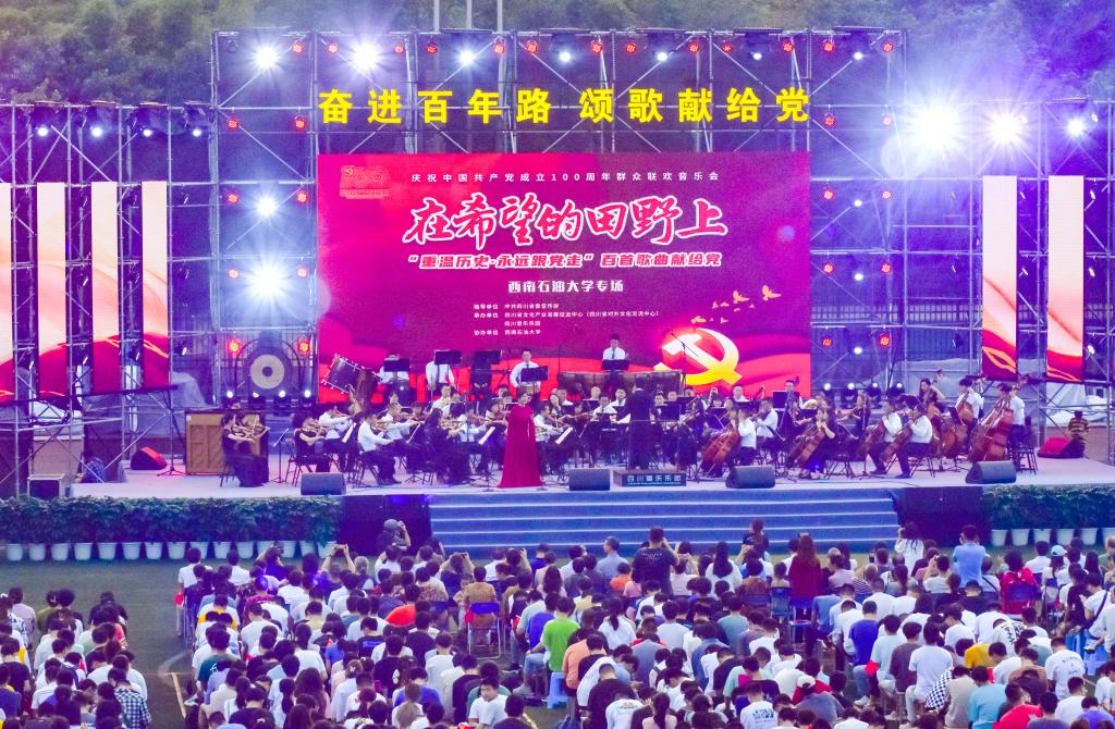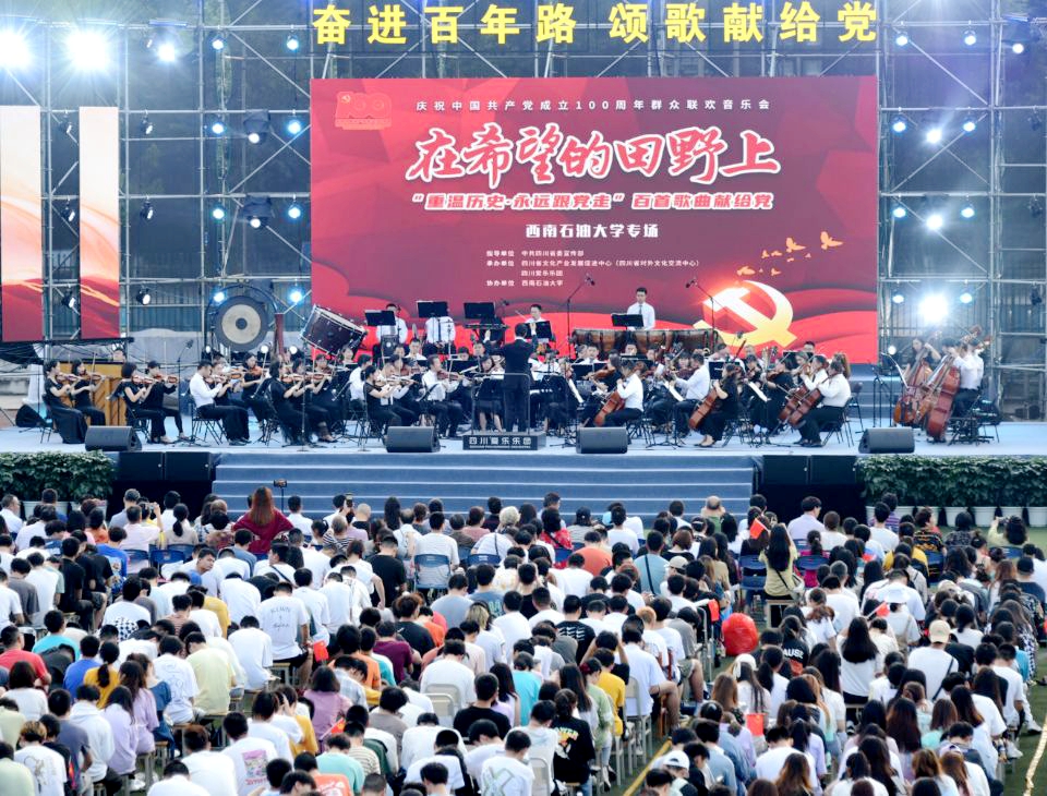 6月26日晚,在《太陽出來喜洋洋》的旋律聲中,四川愛樂樂團拉開了“重溫歷史·永遠跟黨走”百首歌曲獻給黨——慶祝中國共產黨成立100周年群眾聯歡音樂會“在希望的田野上·西南石油大學專場”的序幕。