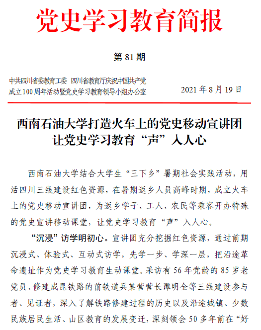8月19日,中共四川省委教育工委、四川省教育廳編發的《黨史學習教育簡報》(第81期)專題報道了我校大學生全媒體中心成立火車上的黨史移動宣講團的事跡,受到全省教育工作部門及各高校的關注。此前,中國教育報首頁、光明日報、中國科學報、四川日報、學習強國首頁、中國教育新聞網、四川新聞網、川觀客戶端等媒體均作了報道。