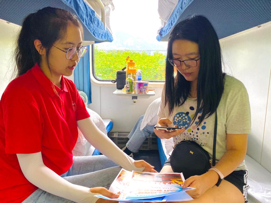 “掃碼就能立刻了解您現在所在站點的三線故事。”宣講團成員王嘉禾一邊向乘客們發宣傳海報,一邊介紹到。成員們不僅在火車上、沿線實地講,還將火車上的黨史學習教育鏈接到“云”上,方便乘客群眾隨時隨地、身臨其境“重回”艱苦奮斗的拓荒歲月。
