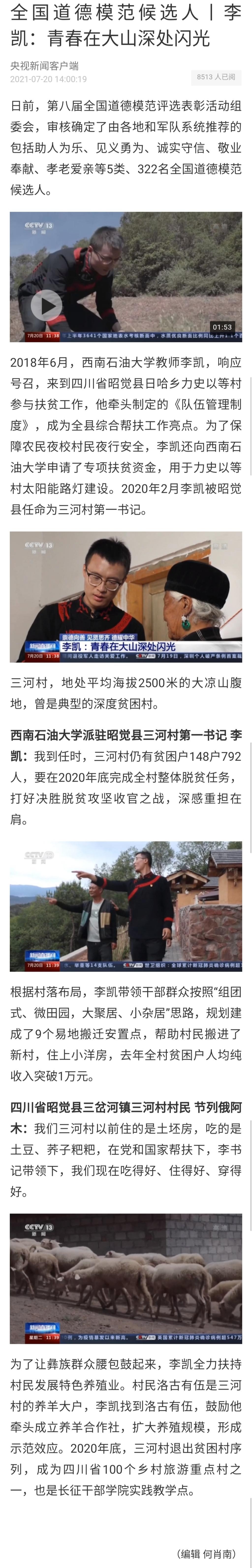 央視展播我校扶貧干部李凱入圍第八屆全國(guó)道德模范候選人的事跡視頻